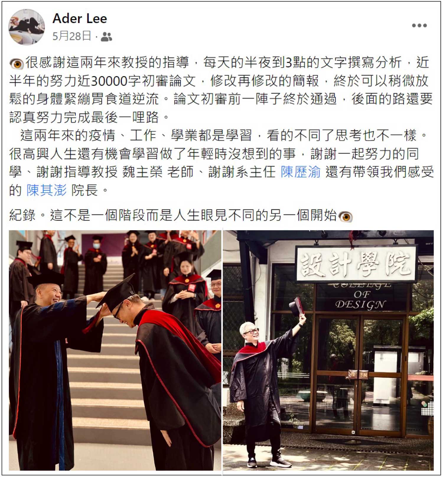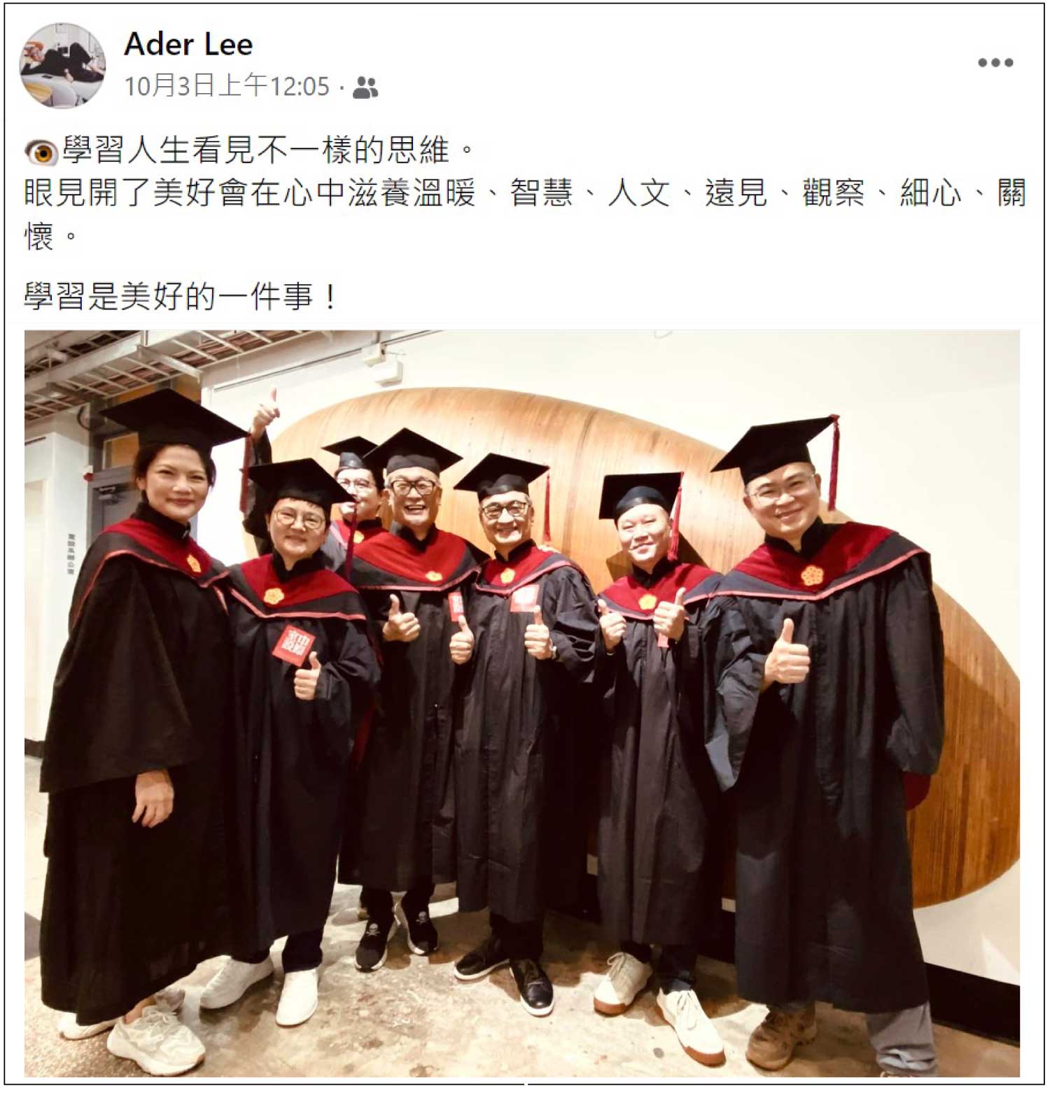 雖然Ader年齡已過40歲,但秉持著對於「學習」的熱忱,他經過兩年的努力與專研,在2022年時,順利地從《中原大學》室內設計學系【碩士在職專班】畢業了!!!!!!!