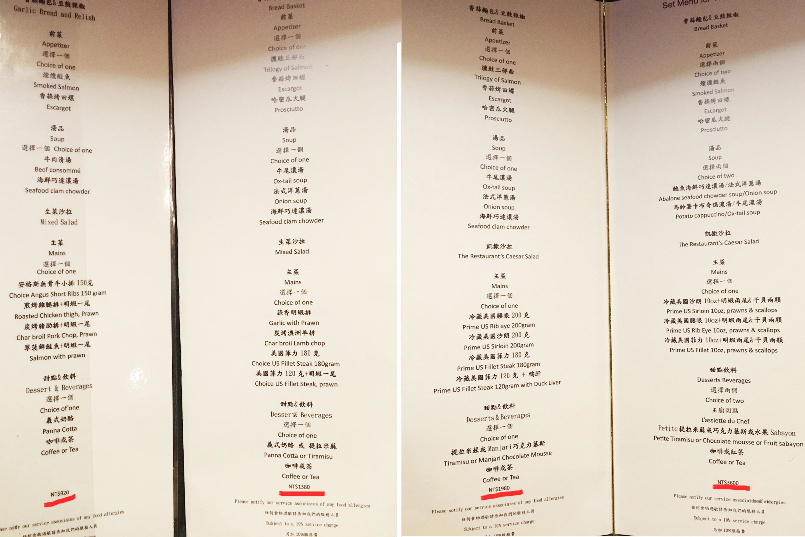 回到座位後我們便被菜單嚇到啦!!! 原本的沙拉吧已經在今年五月底全面撤掉了,而菜單也全新改版,變得比較高檔,但相對的價格提高許多! 新的菜單分為四種套餐,價格為920元、1380元、1980元、3600元! 需額外加10%服務費。 由於我們總共四個人,所以這一餐勢必要花掉五千多元(ˊ_ˋ)…,覺得讓爸媽請客實在是太不好意思啦!!! (立刻卯起來點餐)