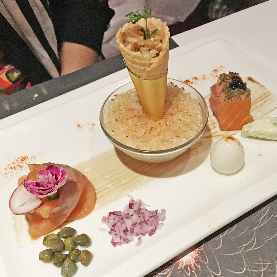 由上圖可知,價錢貴一點的套餐,光是生菜就贏了920元的套餐?;下圖為煙燻鮭魚三部曲,正確吃法是要由圖片的左邊吃到右邊! 註:不敢吃生食的就別點這道囉!!家人吃完覺得還算不錯吃!