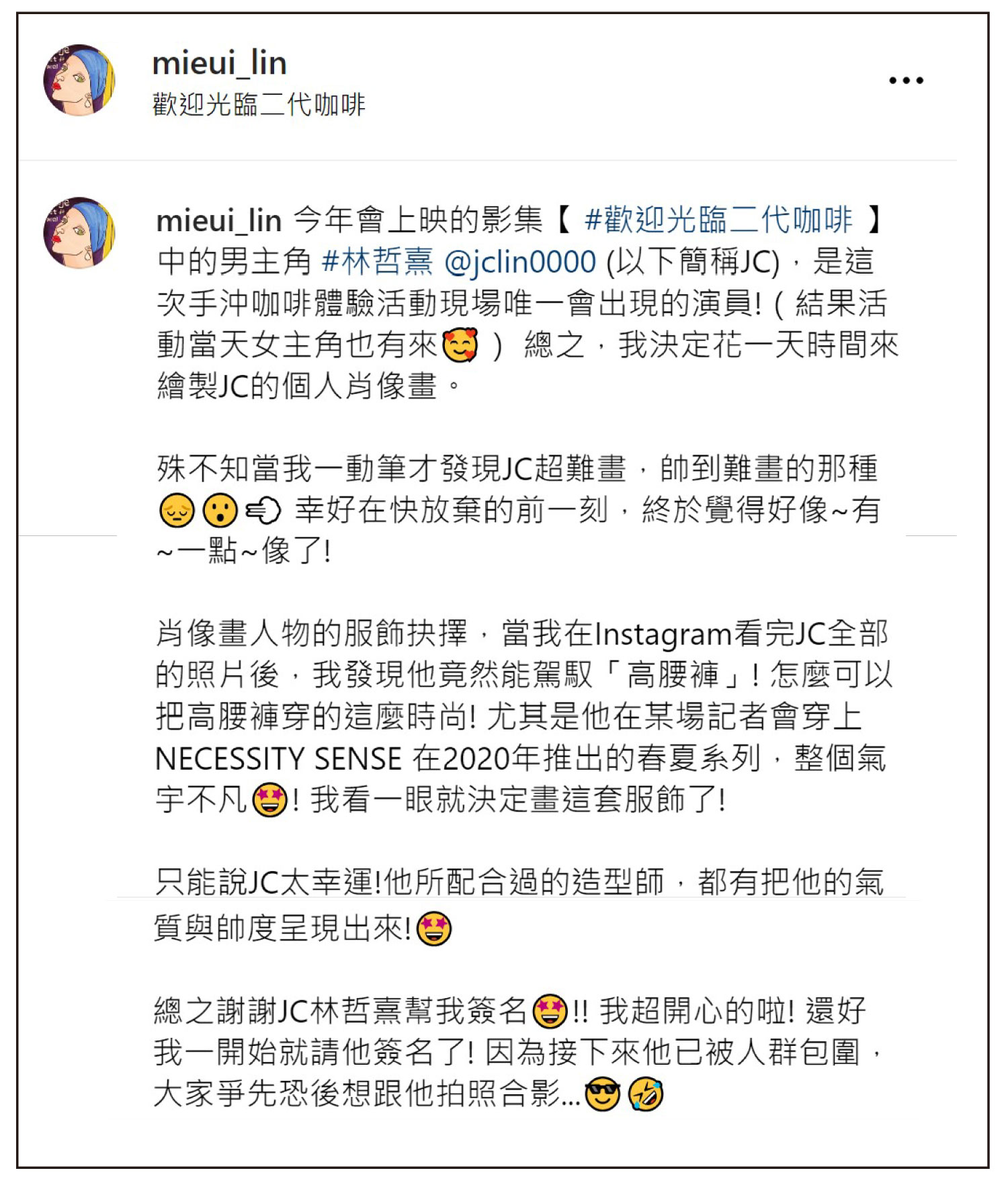 2023年3月,我很高興受到主辦單位邀請,有幸參與由林哲熹主演的影集《歡迎光臨 二代咖啡》見面會 ((延伸閱讀 ── 詳細文章))。搞剛的我特地前一天熬夜畫一張林哲熹的肖像畫送給他,順便索取簽名😍🤩🤩🤩🤩!