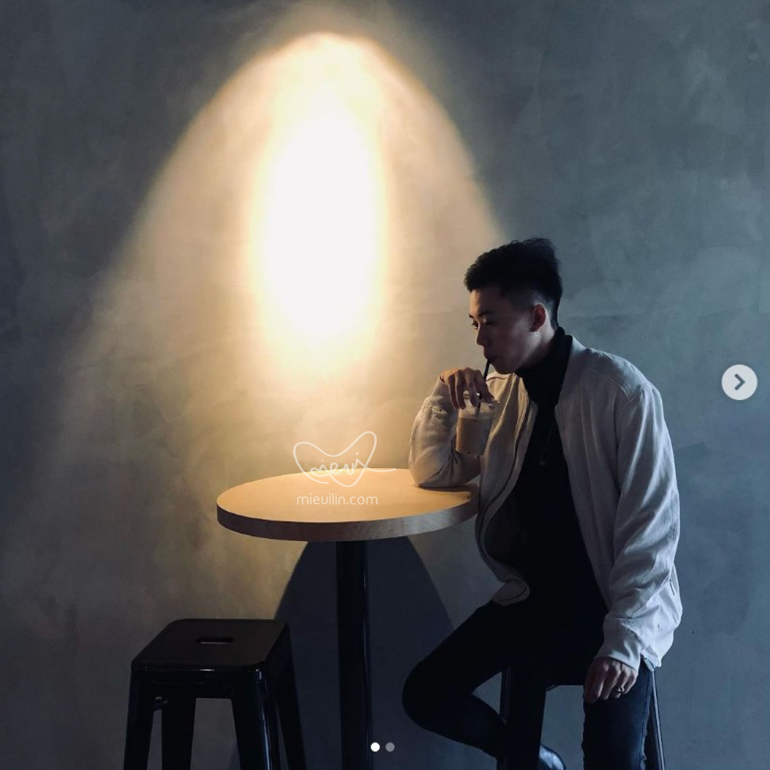 很高興我 Mieui Lin 能擔綱這次的設計師,此次包裝封面的創作靈感來源,正是〈米賀〉高雄新興加盟店 店主Ian ! 記得有一次他在社群平台Instagram上傳一張他正在喝咖啡的照片 (下圖 ) ,這種隨興又帶點惆悵、慵懶的姿態,讓我看一眼就決定,要以這張照片作為禮盒的封面人物!