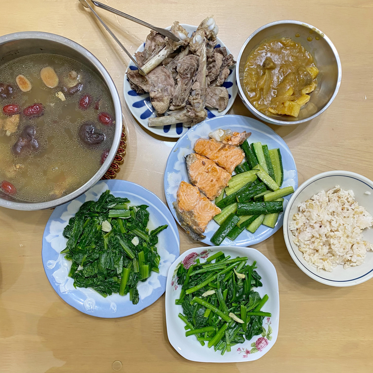 礙於時間的關係,我們坐下暢談的時光其實只有短暫的半小時,與他們道別之後我便趕緊準備今日的晚餐: 香菇雞骨佐紅棗湯、加熱昨日的洋蔥牛肉咖哩、兩道青菜、煎鮭魚、炒小黃瓜。