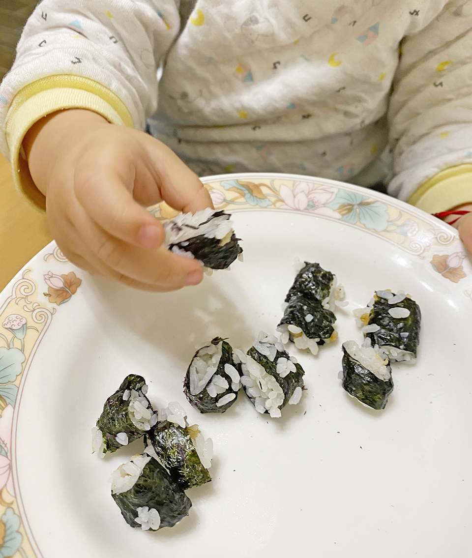 叔叔嬸嬸向我發問了許多關於孩子「吃東西」這方面的問題,因為他們那剛滿一歲的孫女開始不愛喝奶、不吃飯、什麼都不要吃。其實我也還在關關難過關關過中,每天的中餐與晚餐時常讓我感到無奈啊! 明明煮的都是孩子喜歡吃的,但他做勢搖頭不吃就是不吃!! 不過我發現換不同的吃飯工具會引起他的好玩心,他會試圖想用新的工具來進食滿足征服感! 而若不吃白飯,那麼用無添加海苔將白飯包起來,替無聊的白飯增添新鮮感;如今晚的晚餐,他就將我捏的壽司一口接著一口吃完。