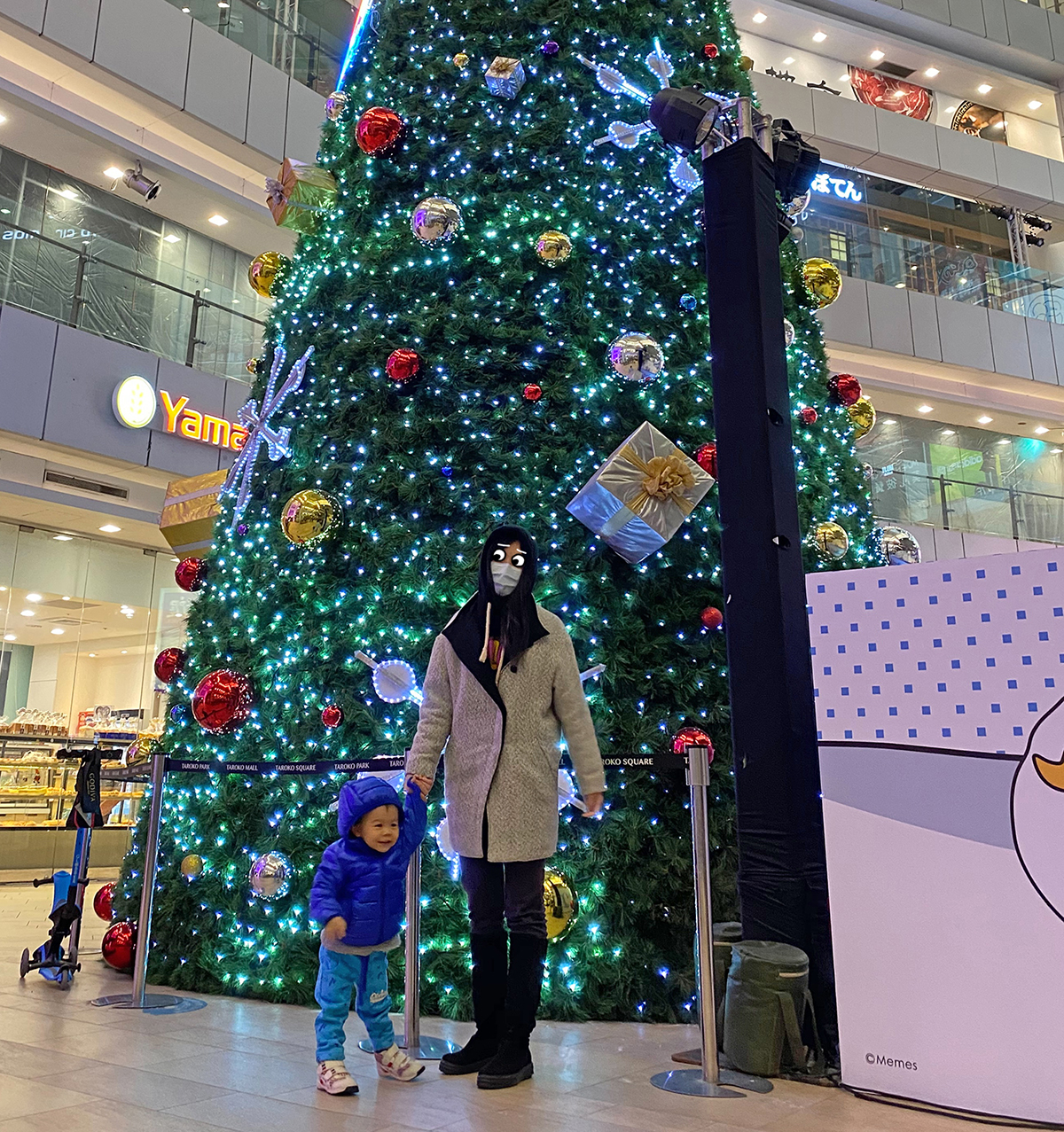 晚上原本要去逛一中街,殊不知車位一位難求,因此我們決定去【新時代】碰碰運氣。很幸運地我們竟然有離電梯很近的親子車位! 在車上的孩子從窗外看見了聖誕樹後就一直嚷嚷著指著那些絢麗的燈光,因此下車後當然要帶他去親臨現場感受一下聖誕節的氛圍! PS: 廣場的風真的爆炸冷!