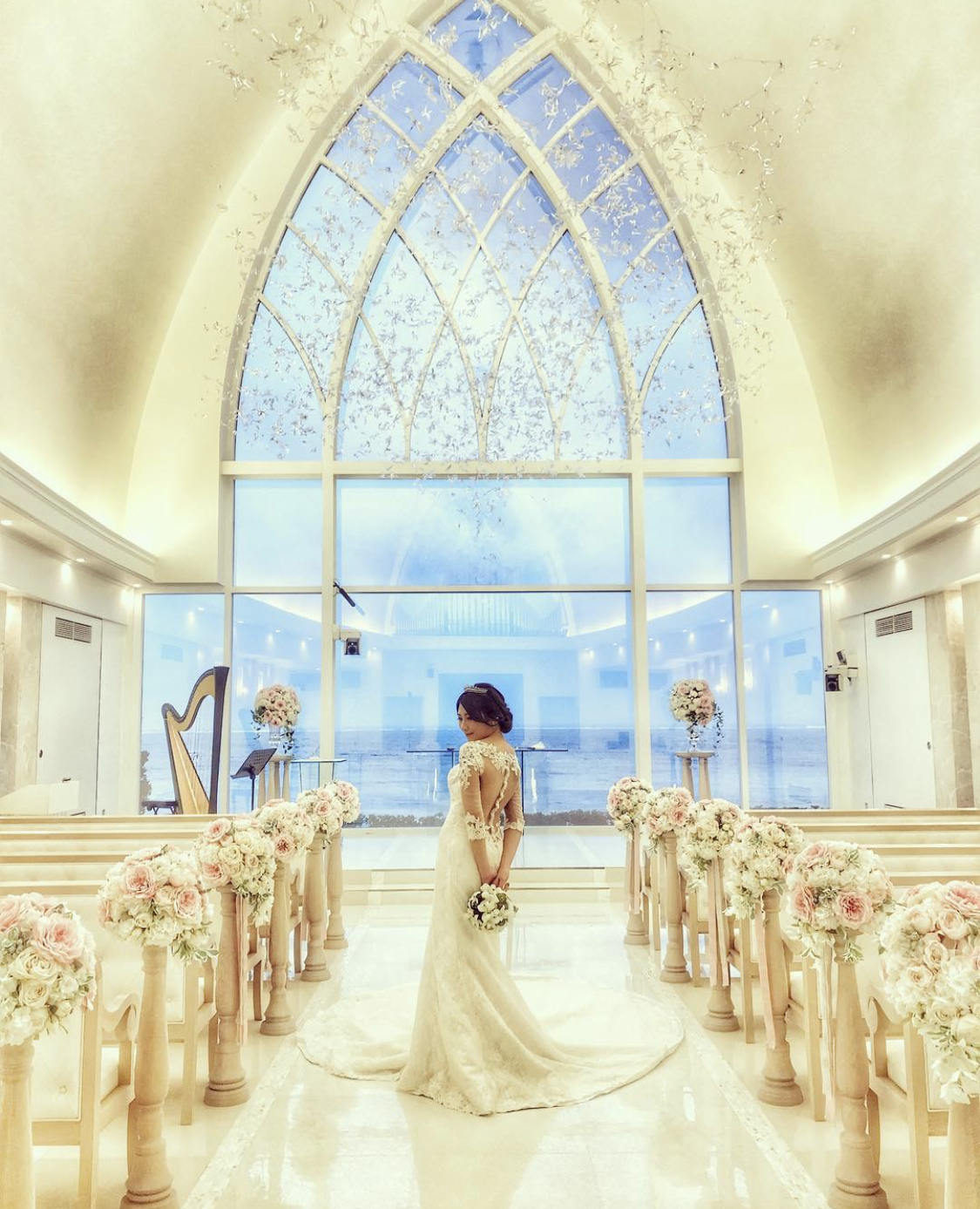 這間教堂座立於讀谷的「Aquagrace Chapel 艾葵雅教堂」,以「水(Aqua)」及「優美(Grace)」為概念,並用琉球石火岩 及琉璃球玻璃打造而成的。美麗流線的白亞教堂聖壇前,是一片廣闊的白色沙灘與翠綠海洋。隨著海風搖曳的 椰樹花園環繞教堂四周,開放式婚宴會場即佇立於其中,這樣具一體感的環境是專為重視隱密感的新人而設。