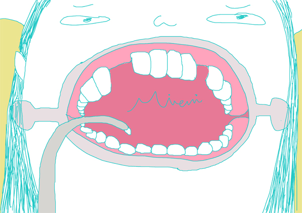沒想到我的嘴巴開始被一個淺白透明的器具硬生生的被迫張大,接著助理姐姐開始在我的牙齒上塗抹,她說要等到抹上去的藥劑乾掉後,才能讓院長幫我黏上那一顆顆的小鋼豆。