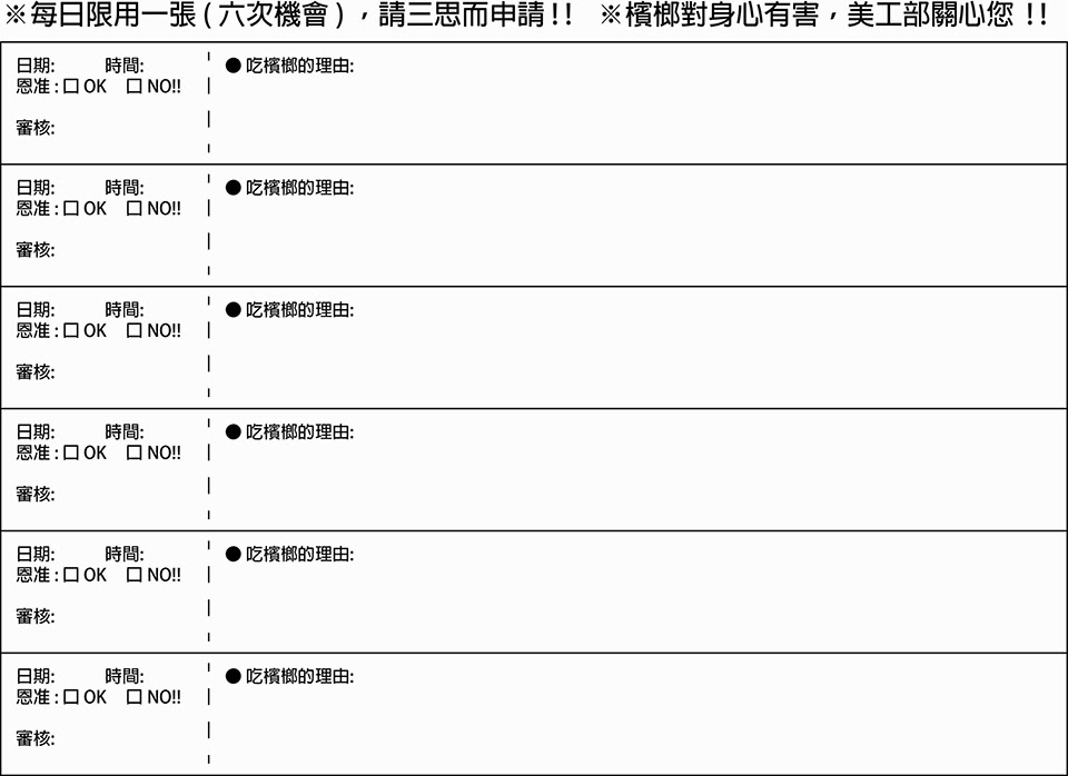 這張申請單的宗旨很簡單,就是希望好料ㄟ未來的某天能戒掉檳榔! 而他每次向我申請的理由是「不能重複」的,且申請不一定會過,但有申請有機會!! (((我真的住海邊…..???!)))