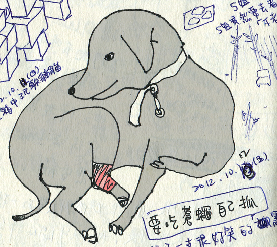 老闆大女兒Judy的女婿 ─ Alvin副總大大,他早上到公司上班時發現他的寶貝愛犬黑點 (公司看門守衛) 竟然受傷了! 牠右後腳疑似被車子輾過 (!?) 導致骨頭外露,於是焦急的Alvin請品管羅大哥開著公司貨車載著黑點去醫院就診。