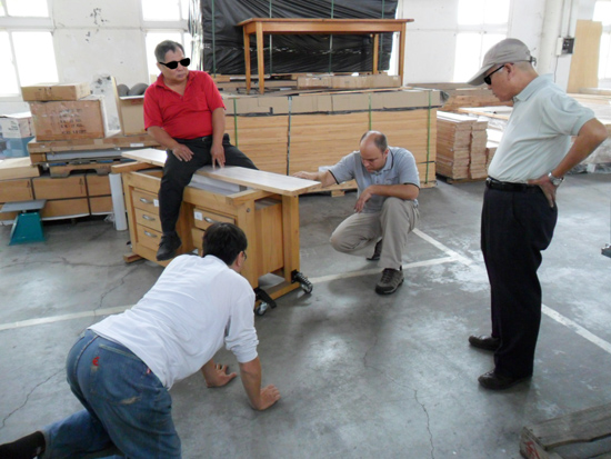 別問我廠長坐在上面幹嘛? 他只是單純想用自己的重量,來測試產品的耐重度…🙄;而〈研發部〉課長好料ㄟ則是很敬業的趴在地上,跟著Dave研究產品上的輪子….。