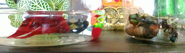 晚上我特地放了大紅鬥魚陪伴著牠睡覺!