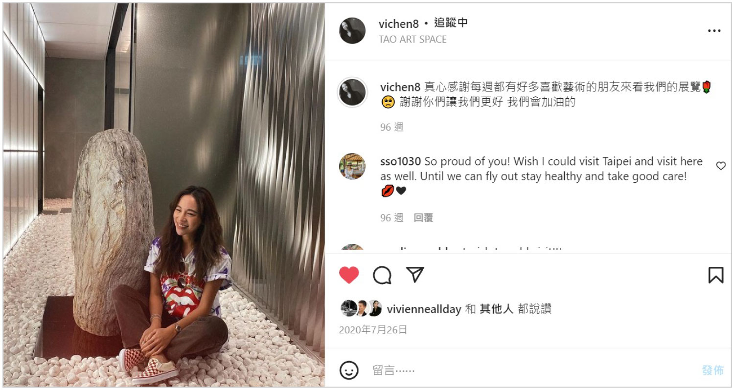陳薇捷 Vicky Chen 為 台北當代藝廊/藝術展覽空間 ─ 《TAO ART SPACE》創辦人之一,同時也是藝術收藏家。陳薇捷 Vicky Chen活躍於社群平台Instagram,她的帳號為@vichen8 ,裡面充滿著她對於藝術的熱愛與觀點。