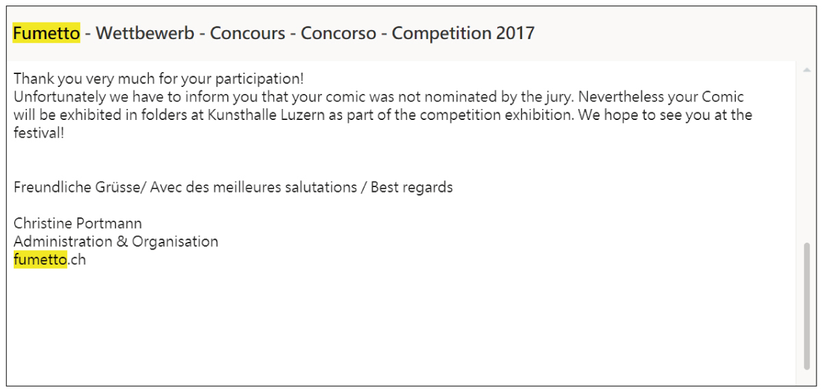 雖然我在這次的競賽中並沒有獲獎,但很高興能收到主辦單位《Fumetto》傳來的通知,我投稿的兩張作品會在2018年04月14日至22日這期間與得獎者的作品一同在瑞士的畫廊《Kunsthalle Luzern》展覽,而這間畫廊時常展示具有前衛設計感的當代藝術作品。